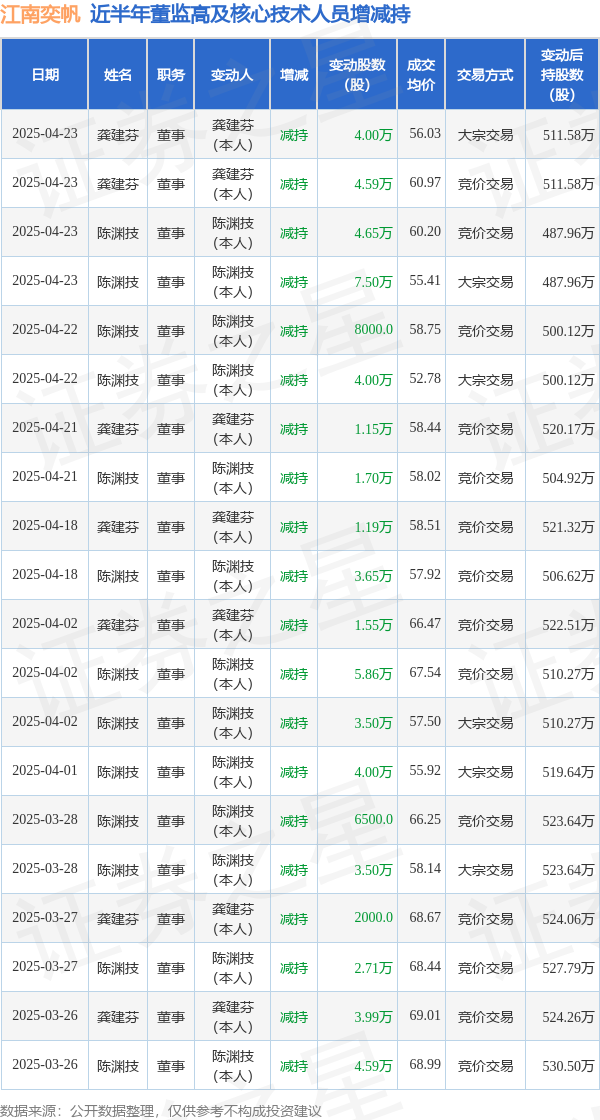 江南奕帆近半年内的董监高及核心技术人员增减持详情如下: